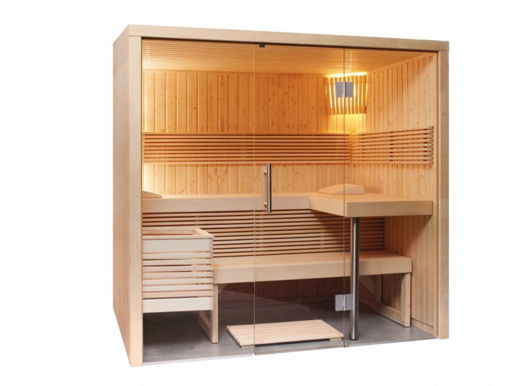 Priestranná fínska sauna z masívneho smreku pre 5 osôb. MADE ina EU. Možnosť dokúpenia Led sady za 1006€.